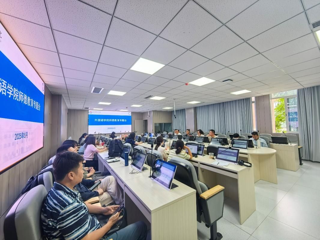 为深入贯彻落实习近平新时代中国特色社会主义思想,强化师德师风建设第一标准,根据学校党委关于开展师德专题教育的统一部署,外国语学院以“强师德、铸师魂、育新人”为主线,于2025年5月在全院范围内组织开展了师德师风教育活动,推动教育家精神融入教师队伍建设全过程。